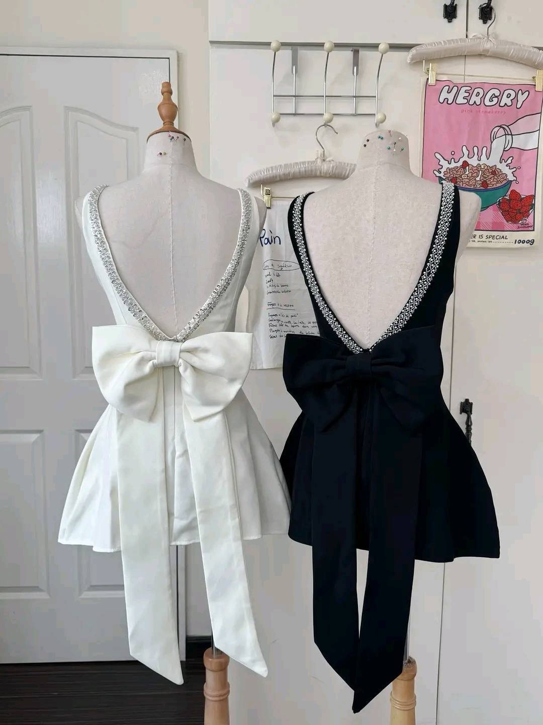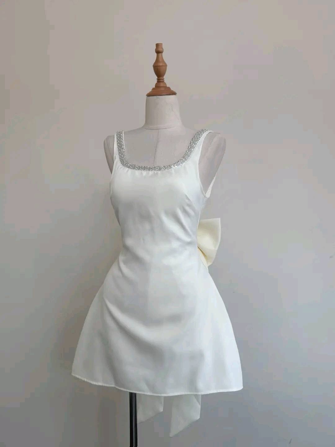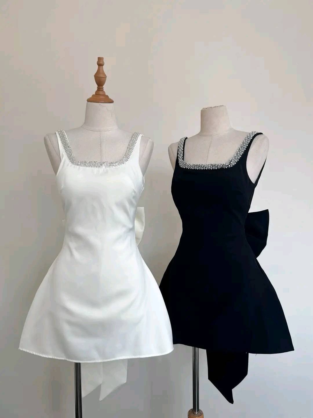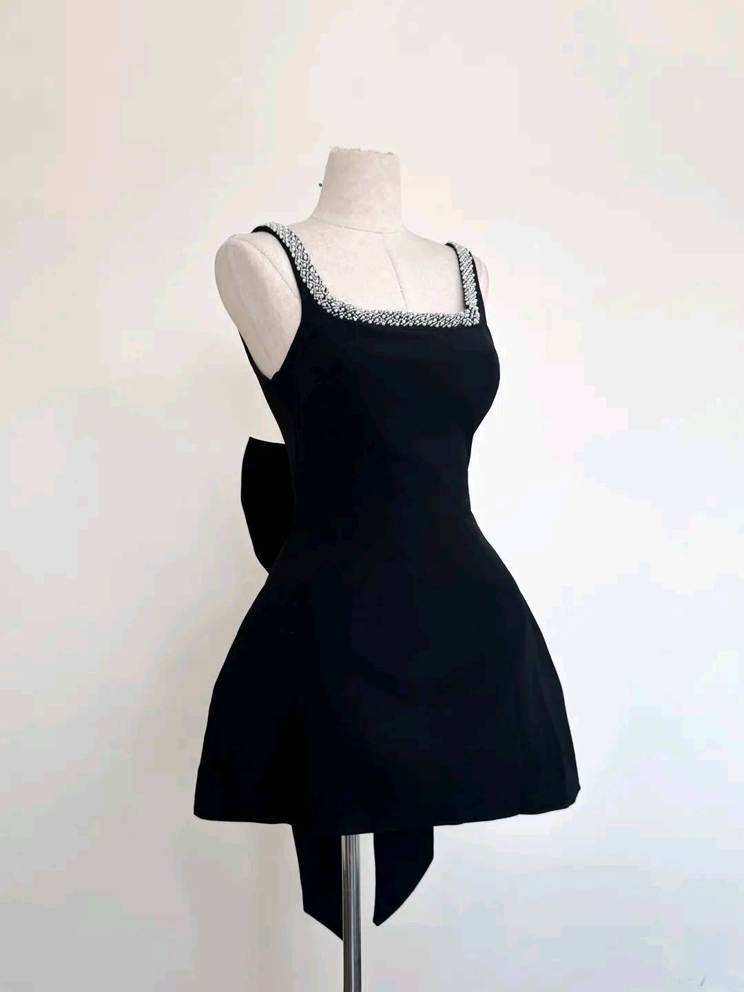 Make a statement in this stunning mini dress designed to turn heads from every angle. Featuring a daring deep V-back outlined with sparkling crystal trim, it perfectly balances elegance and allure. The oversized bow detail at the back adds a touch of playful sophistication, while the flared mini skirt brings a chic, feminine finish. Available in classic black or timeless white, this dress is perfect for parties, special occasions, or any night you want to shine.